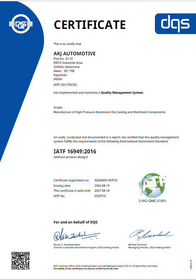 AKJ Automotive is certified to IATF: 16949:2016, ISO9001:2015 for the manufacturing of High Pressure aluminum Die castings, Precision Machined components.